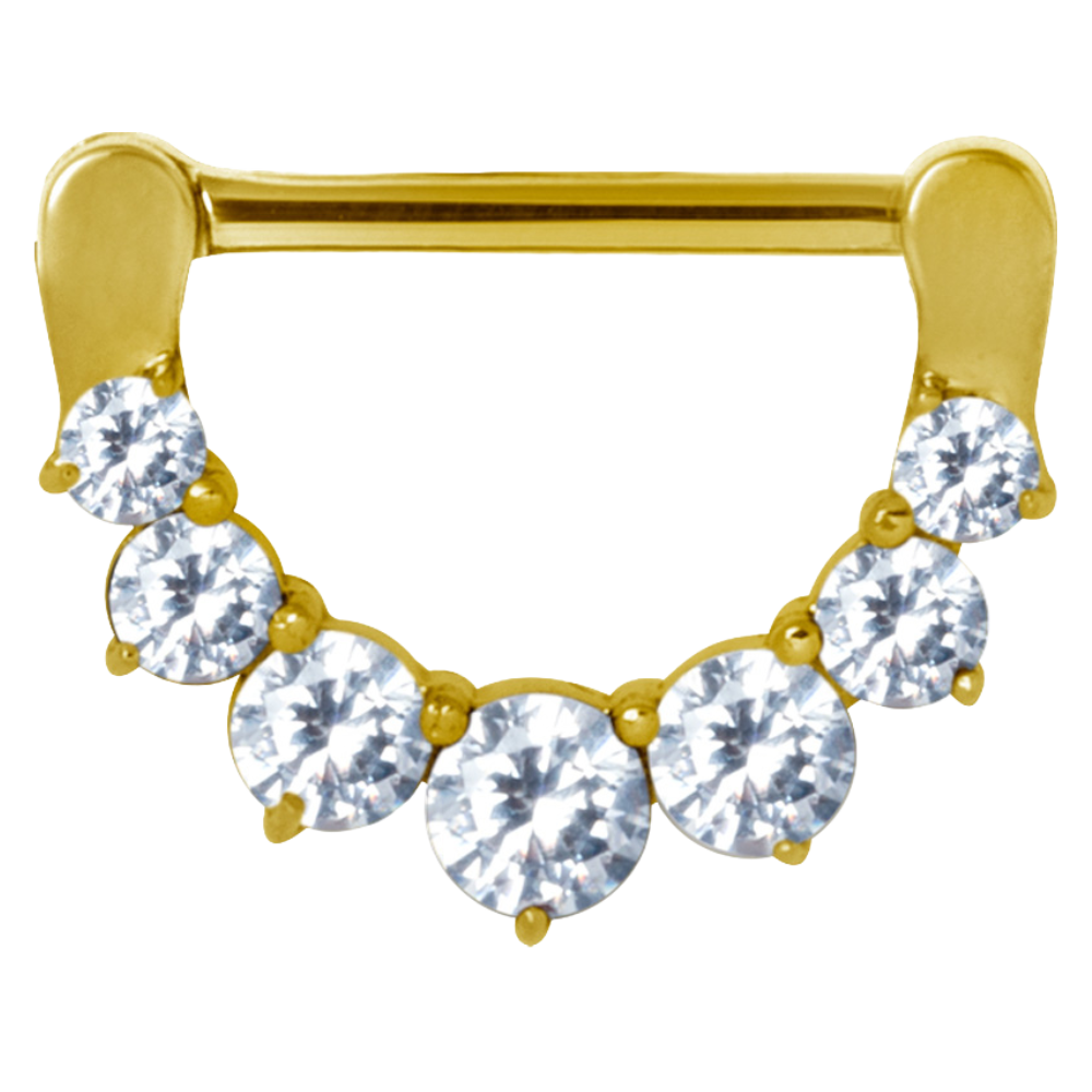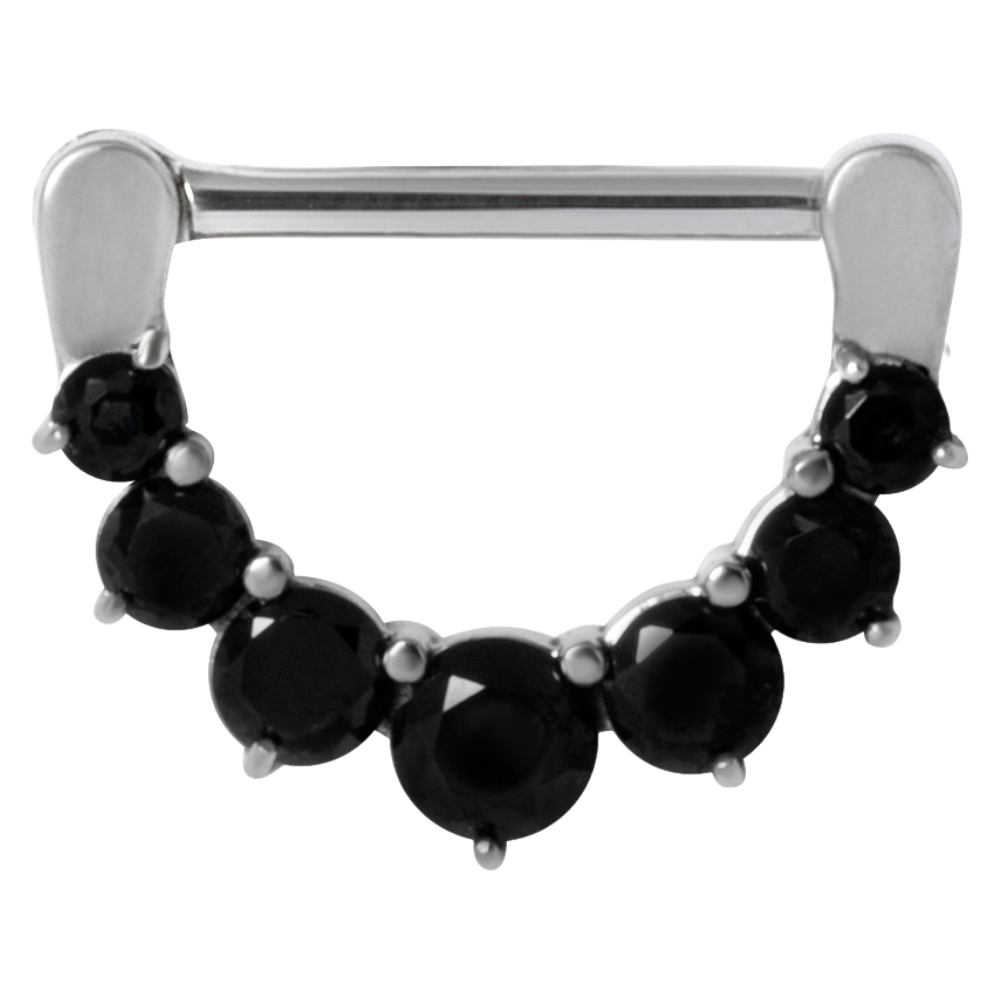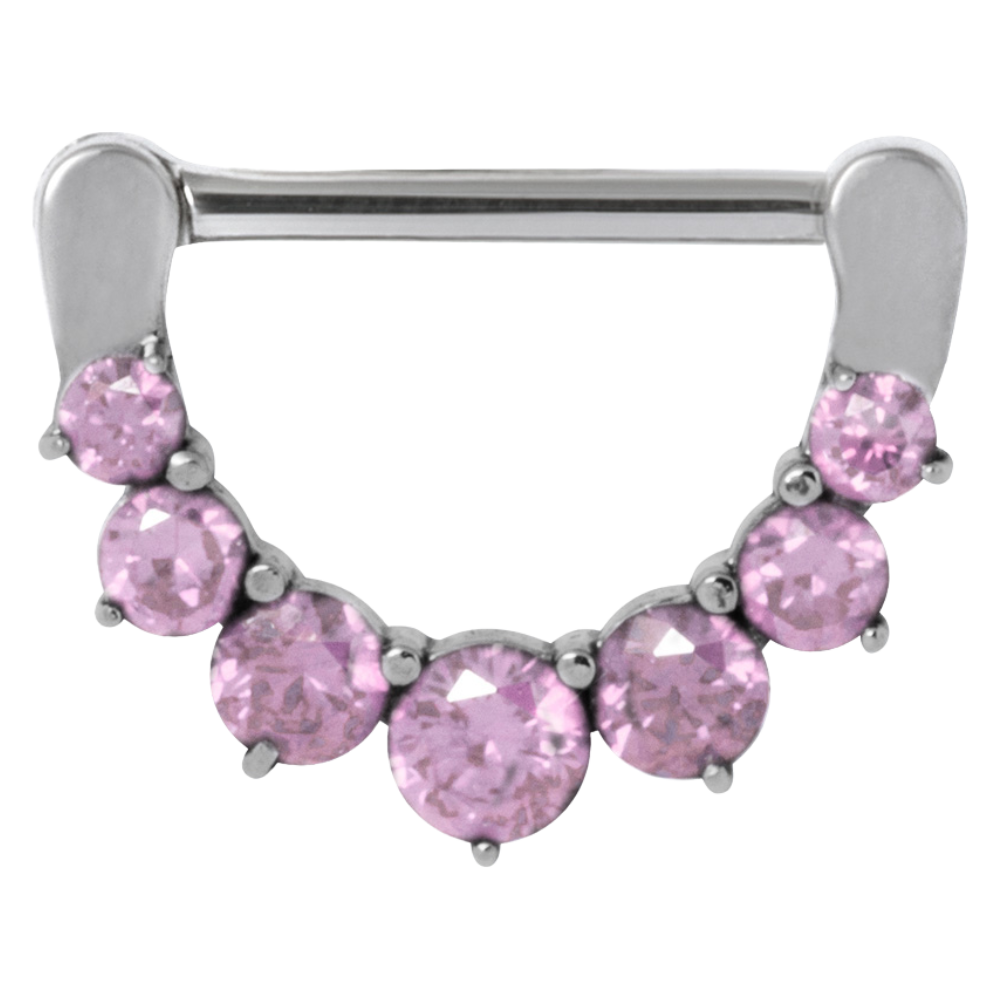 This nipple clicker showcases a graceful row of graduating size stones, creating a sleek and balanced sparkle. Designed for healed piercings. Sold individually.
