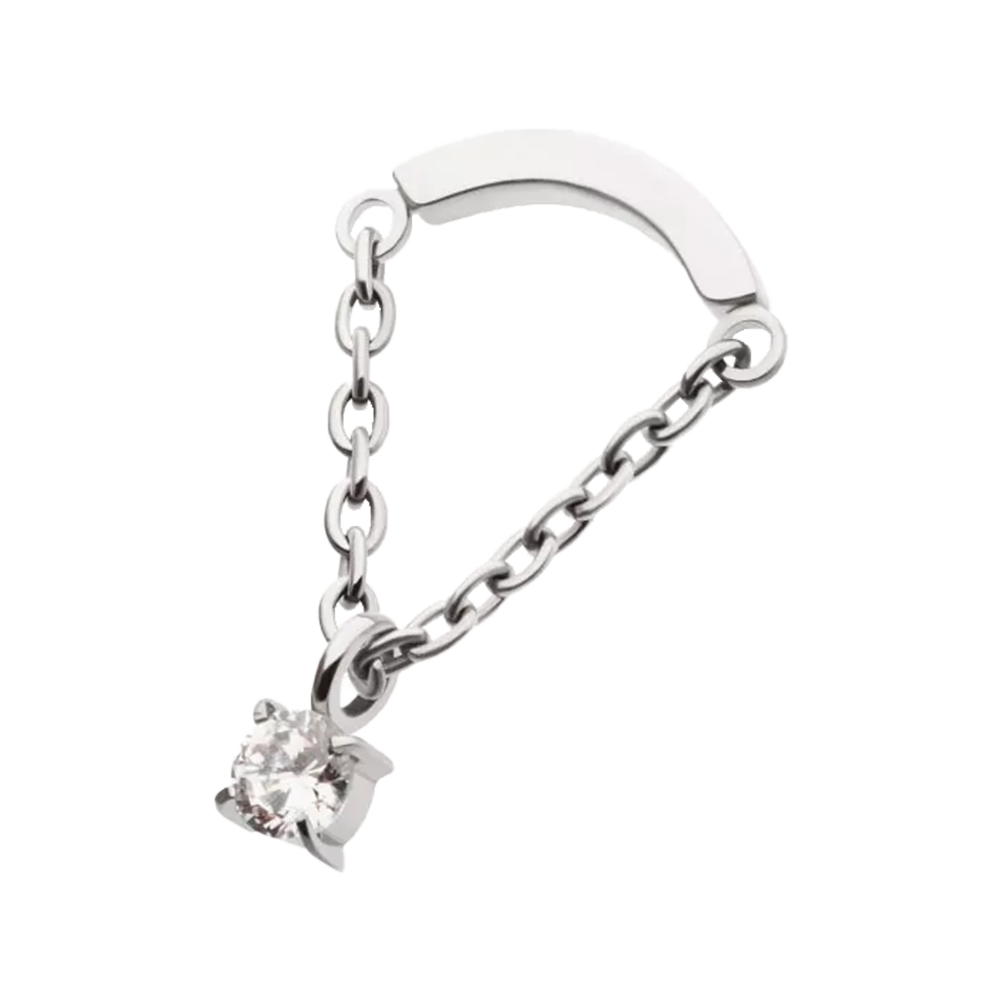Titanium Threadless Curved Bar Top with Dangle Chain & Prong Set Round AAA CZ. This Threadless Top is made from Implant Grade Titanium TI-6AL-4V ELI ASTM F136 with 25g durable Titanium Pin designed to be practical and easy to use. Fitting all sizes of pins and bases in our threadless body jewellery line.